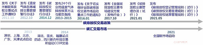 ? 2011-2017年地方试点和框架探索:2011年10月国家发改委《碳排放权交易试点工作通知》,确立7个国内碳排放权交易试点(北京市、天津市、上海市、重庆市、深圳市、广东省、湖北省); 2012年6月国家发改委《温室气体自愿减排交易管理暂行办法》,为CCER交易市场搭建起整体框架;2013年开始试点交易;2014年发布的《碳排放权交易管理暂行方法》首次从国家层面上明确了全国统一的碳市场总体框架;2015年9月《中美元首气候变化联合声明》首次提出将于2017年启动全国碳排放交易体系