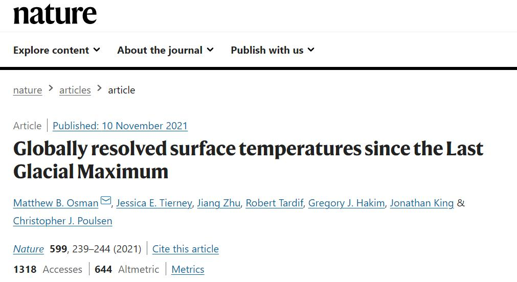 近期,在《自然》杂志上发表的一项研究中,Osman等人通过将代理数据和模型结合起来重建过去24000年间全球气温的演变。